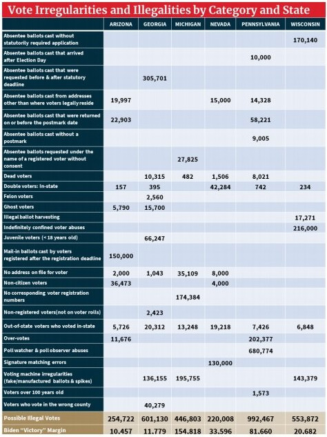 “The broader goal of this final installment of the Navarro Report is to provide investigators with a well-documented tally of potentially illegal votes on a state-by-state and category-by-category basis. This tally is presented in Figure One on the next page of this report. Note that each number in this figure has a corresponding endnote identifying the source of the number. Note further that we have taken a conservative approach to the count of potentially illegal ballots,” the report continues.