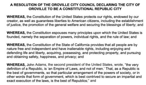 Records show that at a council meeting, after considering such subjects as whether to lease a photocopying machine for $219 a month and a proposal from a firm called D.H. Slater & Sons for the demolition and remodeling of part of a local public safety building, the leaders adopted a resolution declaring Oroville a “Constitutional Republic City.” The document said that Oroville would no longer recognize the authority of the executives of the state of California and the U.S. federal government: